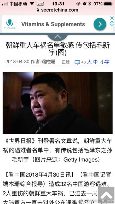 不过独立学者司马南5月1日晚微博消息及今早晒出的一张毛新宇的清晨照片,毛新宇朝鲜车祸死亡事件应为躺枪.