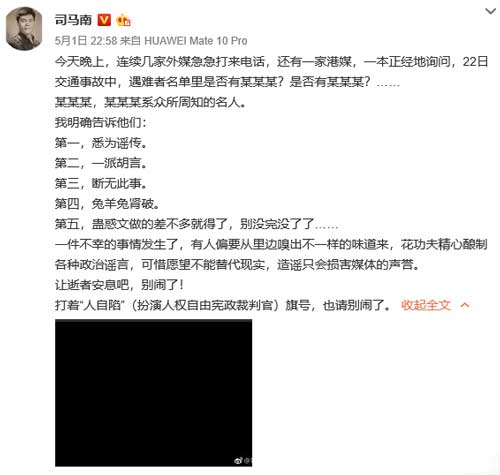 司马南微博称:今天晚上,连续几家外媒急急打来电话,还有一家港媒,一本正经地询问,22日交通事故中,遇难者名单里是否有某某某?是否有某某某?……
