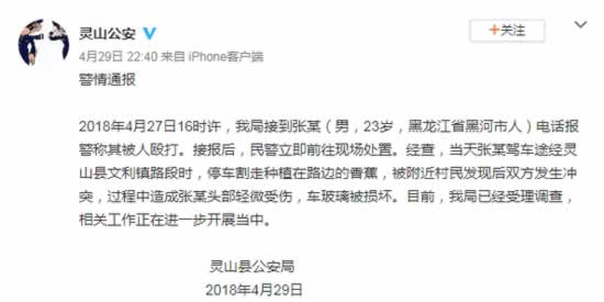 2018年4月27日16时许,我局接到张某(男,23岁,黑龙江省黑河市人)电话报警称其被人殴打。接报后,民警立即前往现场处置。经查,当天张某驾车途经灵山县文利镇路段时,停车割走种植在路边的香蕉,被附近村民发现后双方发生冲突,过程中造成张某头部轻微受伤,车玻璃被损坏。目前,我局已经受理调查,相关工作正在进一步开展当中。