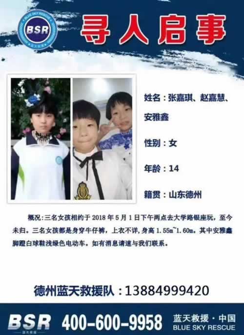 5月1日下午2点左右,德州市三名女孩张嘉琪、赵嘉慧、安雅鑫相约到大学路银座逛街游玩。当晚,三名女孩均未回家,家长寻找一天未果。