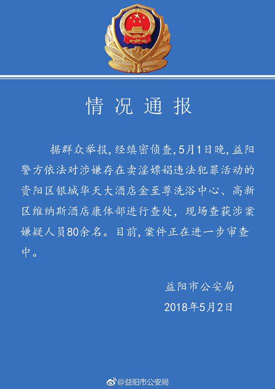 针对“湖南益阳华天酒店扫黄,一大群帅哥、靓女赤身裸体被抓”一事,益阳市公安局官方微博@益阳市公安局5月2日晚发布通报称,5月1日晚,益阳警方依法对涉嫌存在卖淫嫖娼违法犯罪活动的资阳区银城华天大酒店金至尊洗浴中心、高新区维纳斯酒店康体部进行查处,现场查获涉案嫌疑人员80余名。