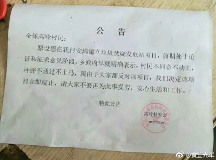 网传,据微博网友@黄登光军:去年7月骗老百姓垃圾焚烧项目立即废止,今年又偷偷上马。老百姓抗议后又来个公告绝不开工,故技重施。这个盖有高领乡政府的公章发出来的公告高领人民是不会信的。