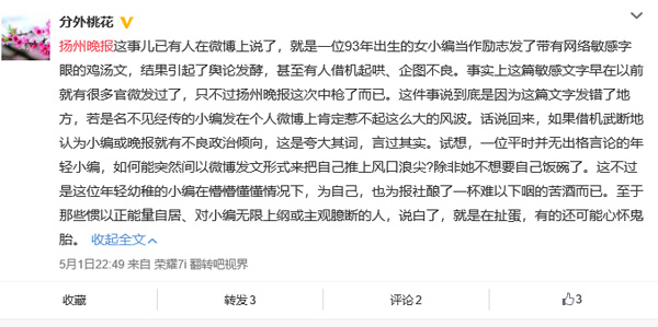 网友@分外桃花:扬州晚报这事儿已有人在微博上说了,就是一位93年出生的女小编当作励志发了带有网络敏感字眼的鸡汤文,结果引起了舆论发酵,甚至有人借机起哄、企图不良。事实上这篇敏感文字早在以前就有很多官微发过了,只不过扬州晚报这次中枪了而已。这件事说到底是因为这篇文字发错了地方,若是名不见经传的小编发在个人微博上肯定惹不起这么大的风波。话说回来,如果借机武断地认为小编或晚报就有不良政治倾向,这是夸大其词,言过其实。试想,一位平时并无出格言论的年轻小编,如何能突然间以微博发文形式来把自己推上风口浪尖?除非她不想要自己饭碗了。这不过是这位年轻幼稚的小编在懵懵懂懂情况下,为自己,也为报社酿了一杯难以下咽的苦酒而已。至于那些惯以正能量自居、对小编无限上纲或主观臆断的人,说白了,就是在扯蛋,有的还可能心怀鬼胎。