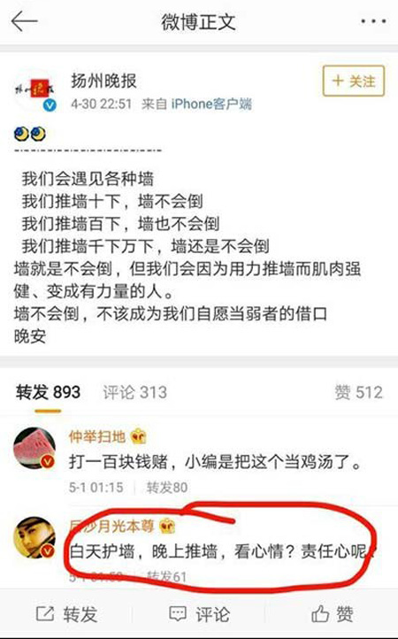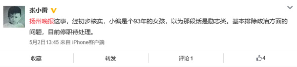 网曝扬州晚报女小编发布励志推墙鸡汤被停职了!据微博认证争鸣传媒总编辑@张小雷:扬州晚报这事,经初步核实,小编是个93年的女孩,以为那段话是励志类。基本排除政治方面的问题,目前停职待处理。