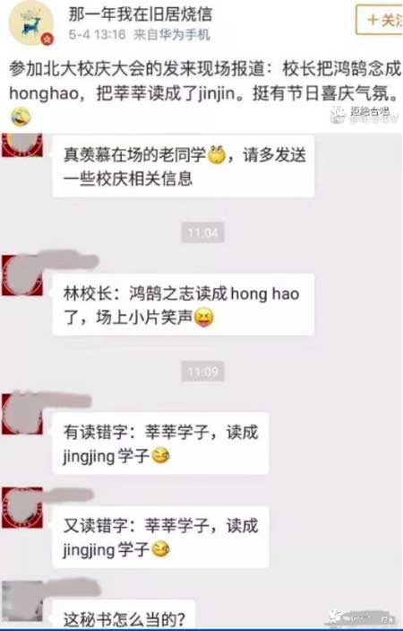 我们发现,不是北大校长不栽跟头,而是校长在挑日子。在北大建校120周年大庆这样的场合,在教育部副部长的监督之下,北大校长林建华把“鸿鹄(hú )志”念成了“鸿浩(hào)志”。很多人都在质疑:堂堂北大校长,怎么还读错字呢?