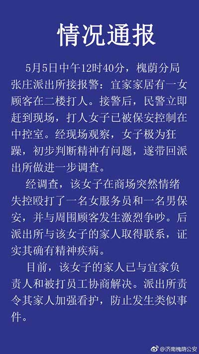 据济南槐荫公安消息,5月5日中午12时40分,济南市槐荫分局张庄派出所接到报警称,宜家家居有一位女顾客在二楼打人。接警后,民警立即赶到现场,打人女子已被保安控制在中控室,经现场观察,女子极为狂躁,初步判断精神有问题,遂带回派出所做进一步调查。经查,该女子在商场突然情绪失控殴打了一名女服务员和一名男保安,并与周围顾客发生激烈争吵。后派出所与该女子的家人取得联系,证实其确有精神疾病。