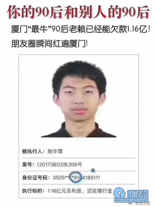 成为老赖之前,施华霖是个年轻的企业家,年仅27岁就已拥有五家公司,注册资本达1500多万元。成为老赖之后,施华霖成了“网红”,有网友调侃他是90后“最牛”老赖,欠款高达1.4亿元。