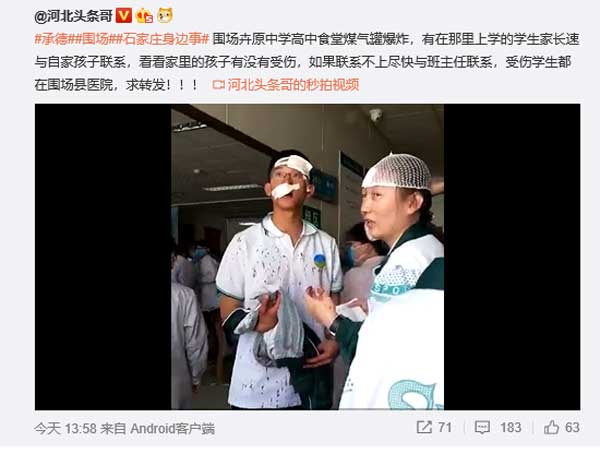 据媒体报道称,5月7日,河北承德围场,卉原中学发生意外事故。现场视频显示,有玻璃被震碎,多名该校学生受伤,衣服破损,身上有血迹。该校负责人称,事发于7日中午该校高中部食堂,一个水罐蒸汽管道爆炸,“冲出来一点气流,把这个玻璃(炸碎)”,多名学生受伤,但没有重伤。围场县县委宣传部称,目前已派人到场了解情况。