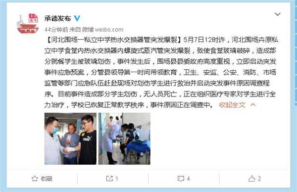 5月7日12时许,河北围场卉原私立中学食堂内热水交换器内螺旋式蒸汽管突发爆裂,致使食堂玻璃破碎,造成部分就餐学生被玻璃划伤,事件发生后,围场县县委政府高度重视,立即启动突发事件应急预案,分管县领导第一时间带领教育,卫生、安监、公安、消防、市场监管等部门应急队伍赶赴现场对划伤学生进行救治并启动突发事件原因调查程序。目前事件造成部分学生划伤,无人员死亡,正在组织医疗专家对学生进行全力治疗,学校已恢复正常教学秩序,事件原因正在调查中。
