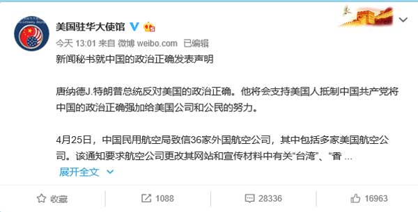 据@美国驻华大使馆官方微博今天13:01消息:新闻秘书就中国的政治正确发表声明.