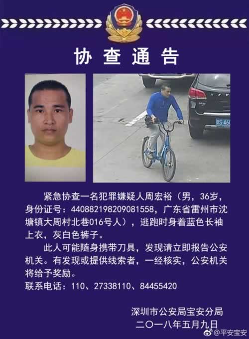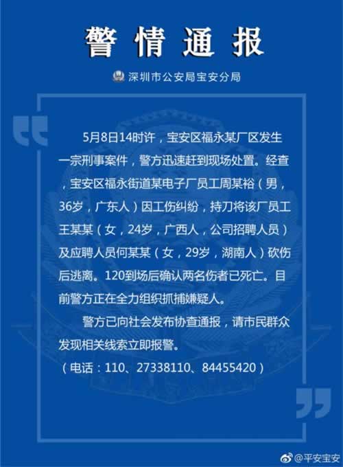 深圳市公安局宝安分局官方微博@平安宝安 5月9日通报,5月8日14时许,宝安区福永某厂区发生一起刑事案件。经查,宝安区福永街道某电子厂员工周某裕因工伤纠纷,持刀将该厂员工王某某及应聘人员何某某砍伤后逃离。120到场后确认两名伤者已死亡。目前警方正在全力组织抓捕嫌疑人。