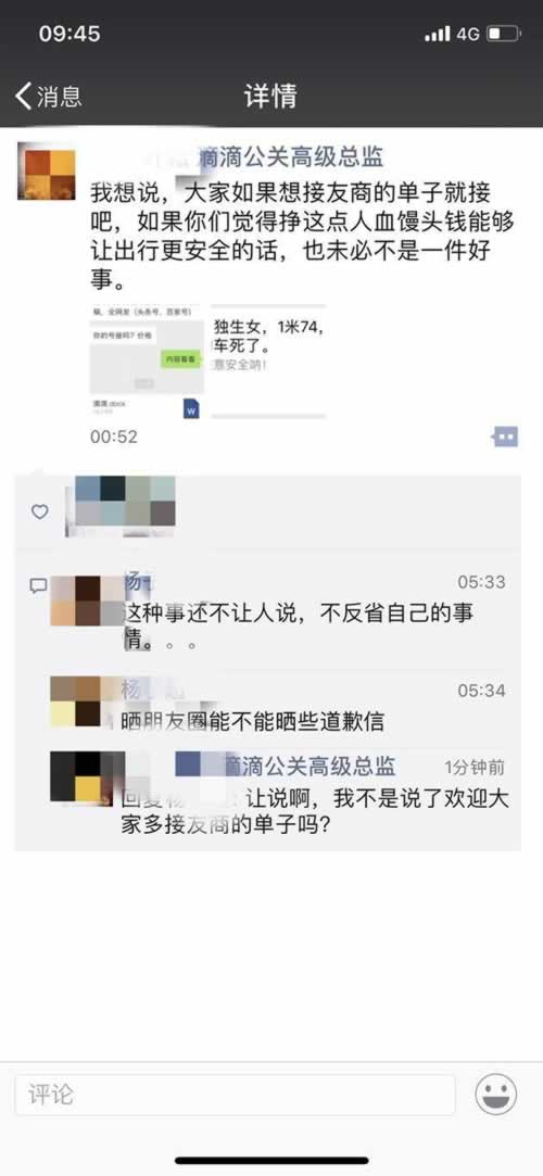 不过今日有滴滴公关在朋友圈称,该事件遭遇友商和媒体抹黑,在晒出两张截图后,他表示:“我想说,如果大家想接友商的单子就接吧,如果你们觉得挣这点人血馒头钱能够让出行更安全的话,也未必不是一件好事。”