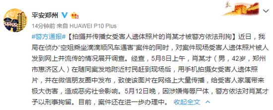 #警方通报#【拍摄并传播女受害人遗体照片的肖某才被警方依法刑拘】近日,我局在侦办“空姐乘坐滴滴顺风车遇害”案件的同时,对案件现场受害人遗体照片被人发到网上并流传的情况展开调查。经查,5月8日上午,肖某才(男,42岁,郑州市惠济区人)在随同案发地附近村民赶到现场后,用手机拍摄女受害人遗体照片,并在微信朋友圈中发布,致使该图片在网络上大量传播,给受害人家属带来极大伤害,造成恶劣社会影响。5月12日晚,因涉嫌侮辱尸体,警方依法对肖某才予以刑事拘留。目前,案件还在进一步办理中。