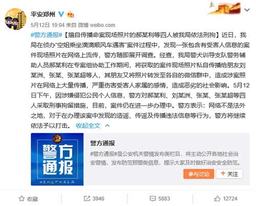 原标题:擅自传播命案现场照片的郝某利等四人被我局依法刑拘
