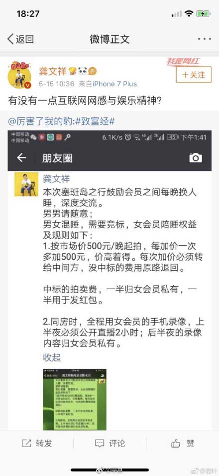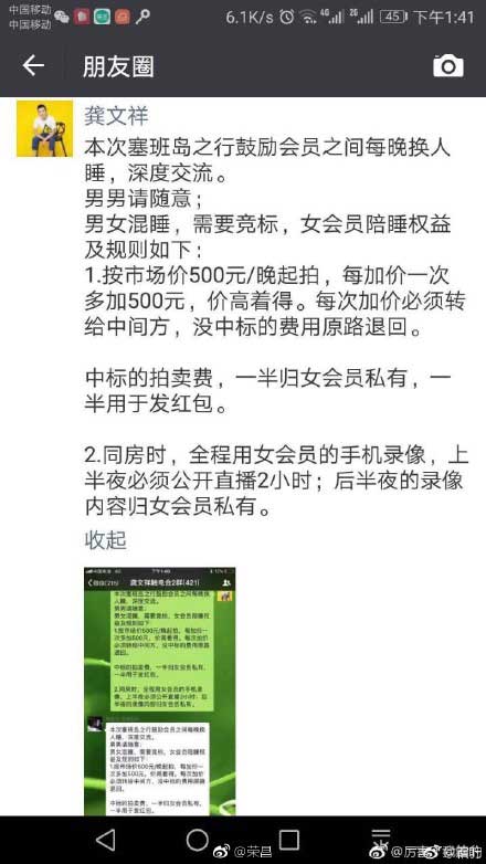 据悉,龚文祥5月13日发布微博消息,称将带领微商圈最顶级旅游团在6月6日开启为期6天的美国塞班岛炫富之旅。5月15日,朋友圈流出一张疑龚文祥塞班岛之行公然在网上拍卖女会员同房过夜权的截图.其内容如下: