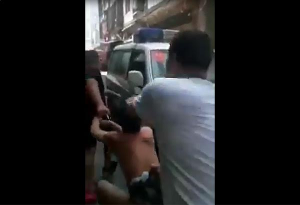 现场另外一个视频显示,三名便衣暴力抓扯一名半裸男子的手及头部将其拖至警车上,男子过程中不停的叫喊,路边有不少群众围观。