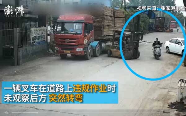 实拍张家港叉车路边突然掉头削掉骑车人16颗牙现场视频