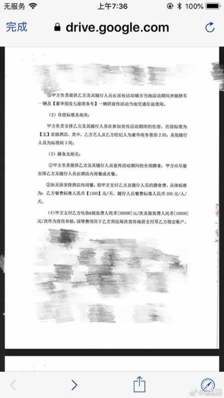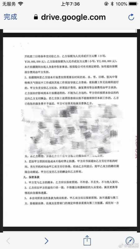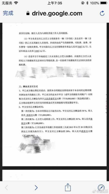 崔永元在微博中晒出疑似是范冰冰的工作合同