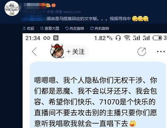 冯提莫称“我的个人隐私你们无权干涉,而且我会包容不会以牙还牙,这样并不会让你进步。有人说我会骂人,骂别的主播,但其实保持开心乐观才是我最想看到的,71070是个快乐的直播间,不会去攻击别的主播,只要你们愿意听我唱歌,我就会一直唱下去”。这次回应冯提莫也是全程保持淡定,在粉丝们的火箭中淡定的说完这些话,也算是首次正面的回应这一整件事了吧。