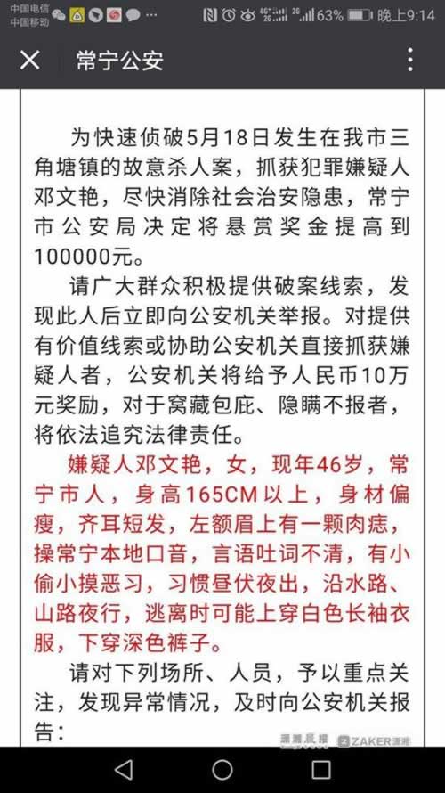 在案发的5月18日,常宁市公安局就曾发布悬赏通告,通告称,犯罪嫌疑人邓文艳,今年46岁,身高165厘米,身材偏瘦,齐耳短发,言语吐词不清,逃离时可能上穿白色长袖衣服,下穿深色裤子。公安机关悬赏一万元。