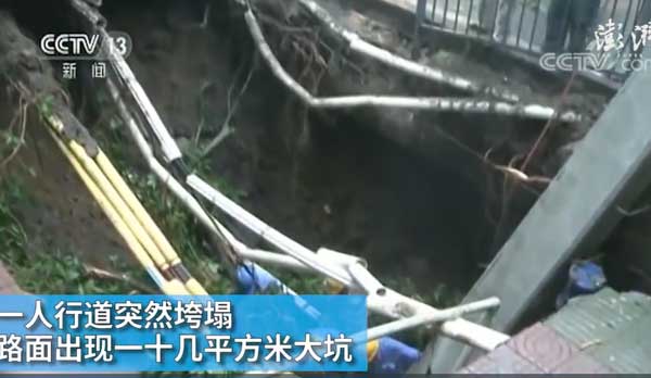 5月27日,重庆。一人行道突然垮塌,路面出现一十几平米坑洞,塌陷造成路面下方主水管爆裂,大水冲到居民家中。目前坑洞已填埋,水电供应恢复正常,事故原因正在调查中。