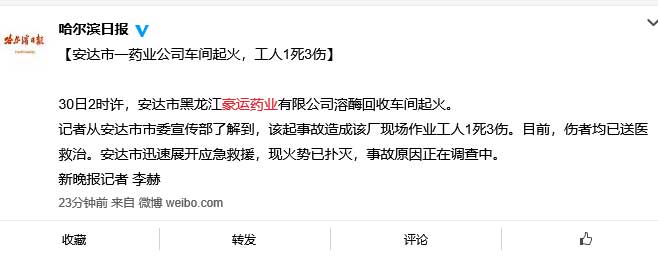 (原标题:黑龙江安达一药业公司发生火灾致1死3伤)