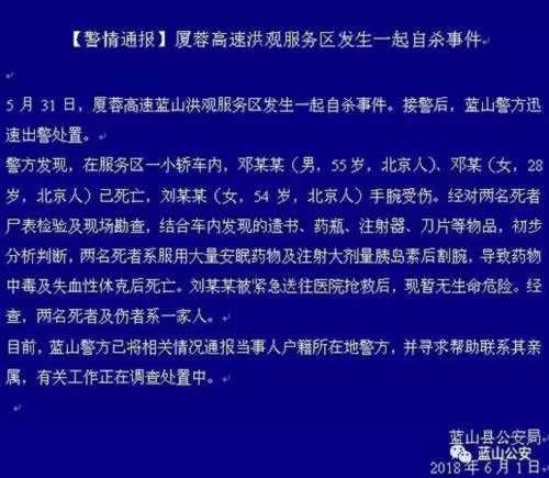 6月2日,据湖南蓝山县警方通报,称5月31日,在厦蓉高速洪观服务区发生一起自杀事件,三位自杀者系一家人,其中两人身亡,一人受伤。