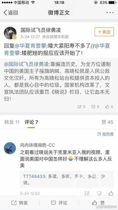微博网友评“国际试飞员徐勇凌”