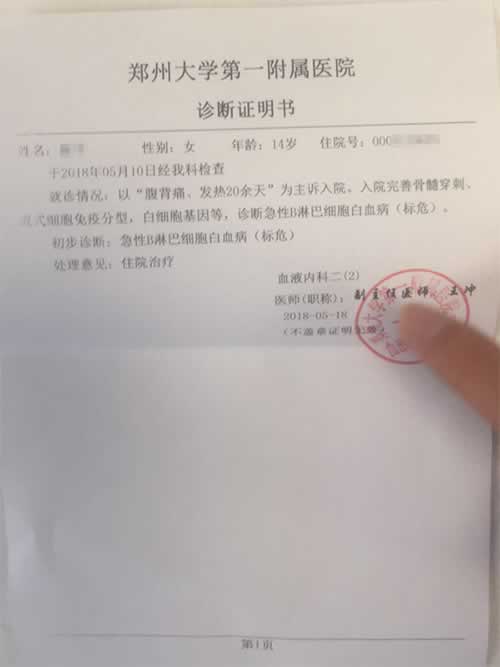 医院给崔桥妹妹开具的诊断证明书,诊断为急性B淋巴细胞白血病(标危)。