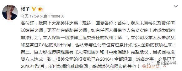 对于外界的阴阳合同的猜测,今日杨子微博回应称,其从未直接以及带任何话给崔永元,更不存在威胁崔永元。