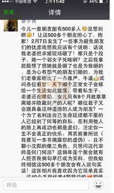 2013年9月疑似汪峰前妻的“康作如”微博发声,不但爆料两人从相识相恋,到结婚再离婚的过程,更斥汪峰“不忠”,称其在离婚诉讼期间与多位女性保持男女关系。“康作如”还表示,汪峰在自己还在哺乳期的时候单方面宣布离婚。直至长微博的曝光,大家才恍然大悟,与汪峰相伴6年半的康作如有可能是汪峰至今关系维持最久的伴侣。两人在2007年相恋,2010年正式领证结婚,2012年女儿诞生。 2013年3月8日汪峰单方提出离婚,8月7日在海淀区阜新路法院协议离婚。按理说,汪峰和康作如离婚很大的原因就是他和章子怡在一起了。而在张子男的微信里也提到了汪峰是一个”带着私生子,老婆还在喂奶,女儿只有8个月就草草离婚并隐藏财产的人“。即使是康作如黑他们,他们也不冤啊。