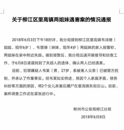 今日中午,柳州市公安局柳江分局发出通报,2018年6月3日下午18时许,分局接到柳江区里高镇韦诗珊(姐姐,现年6岁)、韦慧珊(妹妹,现年4岁)两姐妹的家人报警称,两姐妹在家中附近失踪。接到报警后,我分局迅速开展搜寻和侦查工作,于6月8日凌晨找到了失踪人的遗体,确认两人已经遇害。