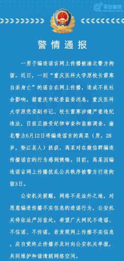 (原标题:“重庆医科大学原校长自杀身亡”系谣言 造谣者被行拘3日)