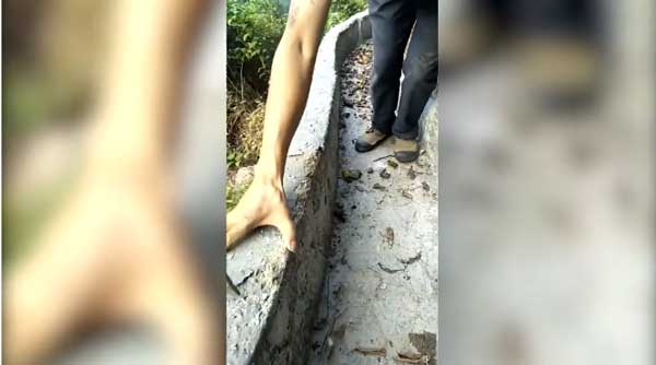 视频显示,一位村民站在一条灌溉堰渠内,单手就将堰渠上的水泥捏掉。(00:42)