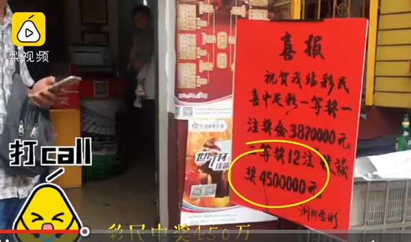 6月20日,湖南浏阳,一中国体育彩票投注站中出一等奖1注,二等奖12注,奖金合计450多万元。体彩中心工作人员称,这是9人合买的传统足彩。