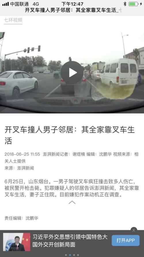 这就更令人费解了,一个靠叉车生活,而且老婆正在住院的去外地讨生活的男人怎么会突然发疯,会开着叉车跑大街上去铲无辜的路人的车辆呢?很快,又有消息传出来,说他是靠贷款买的叉车做叉车出租生意养家,但是,当地村委会不让他做,还报了警。结果警察就隔三差五地查他,今天早上,他在干活警察又去查他,结果,他就开始“技术表演”了。在警方没有真正公布王志华作案动机之前,我不敢说这个消息是准确的,我只能认为这是一种第三方说法,仅作参考。一切以警方通报为准。