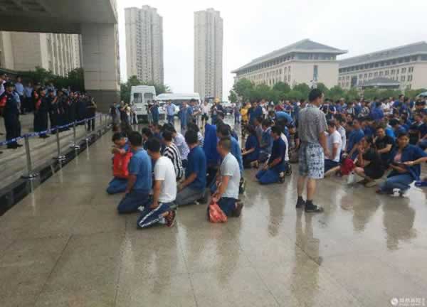 2018年6月26日,6月22日至24日,江西旭阳雷迪高科技股份有限公司(以下简称旭阳雷迪)出现员工集体讨薪事件,员工们反映,公司已经拖欠了员工的4个月工资没有发,并且自2013年起的5年多时间,都没有给员工交社保金。图为6月23日,员工雨中下跪讨薪。
