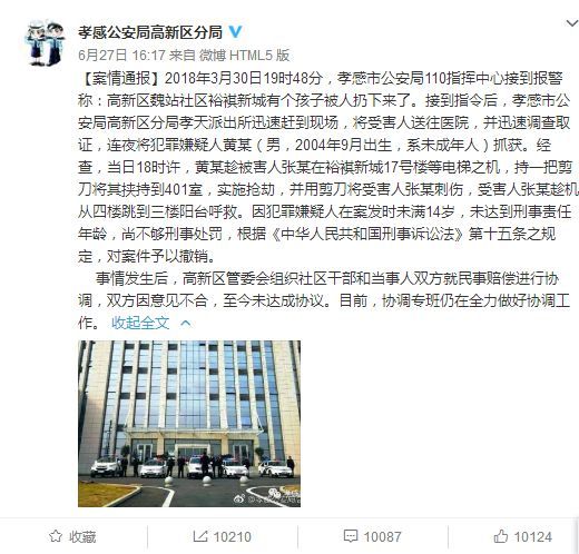 湖北孝感市公安局高新分局官方微信公众号孝感高新公安6月27日公开通报称,今年3月30日,女孩张某在等电梯之机,遭男孩黄某(2004年9月生,系未成年人)用剪刀挟持,实施抢劫,后被剪刀刺伤。