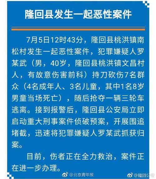 7月5日12时43分,隆回县桃洪镇南松村发生一起恶性案件,犯罪嫌疑人罗某武(男,40岁,隆回县桃洪镇文昌村人,有故意伤害前科)持刀砍伤7名群众(4名成年人、3名儿童,其中1名8岁男童当场死亡),随后抢夺一辆三轮车逃离。接到报警后,隆回县公安局立即启动重大刑事案件侦破预案,开展围追堵截,迅速将犯罪嫌疑人罗某武抓获归案。