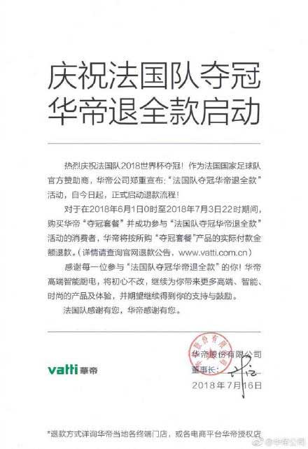 法国队夺冠!华帝启动退全款:营销期间卖了7900万