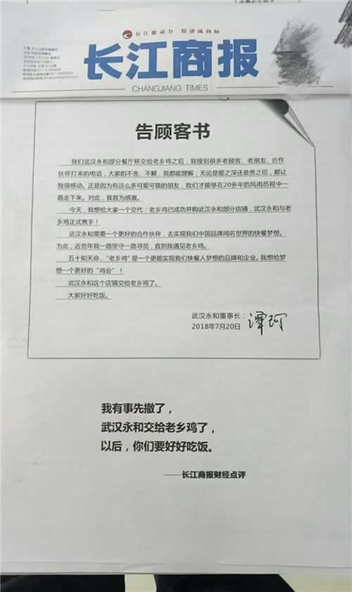 原标题:老乡鸡收购品牌已公开 永和董事长的告顾客书火了!