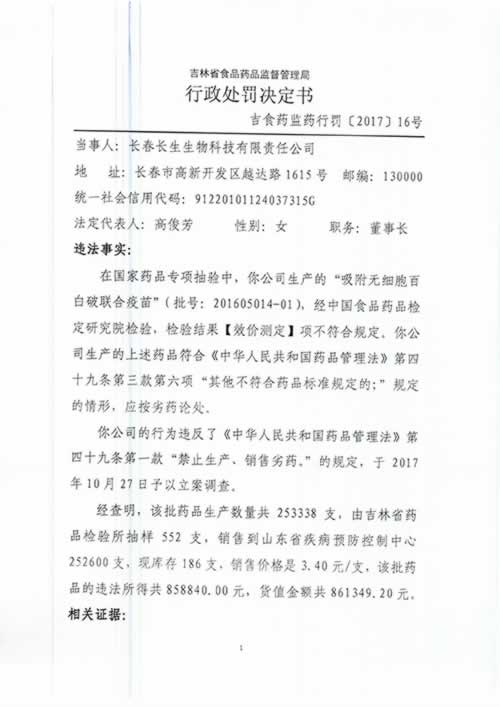 其后,长春长生的母公司长生生物在上市公司公告中披露了百白破疫苗事件的处理结果。