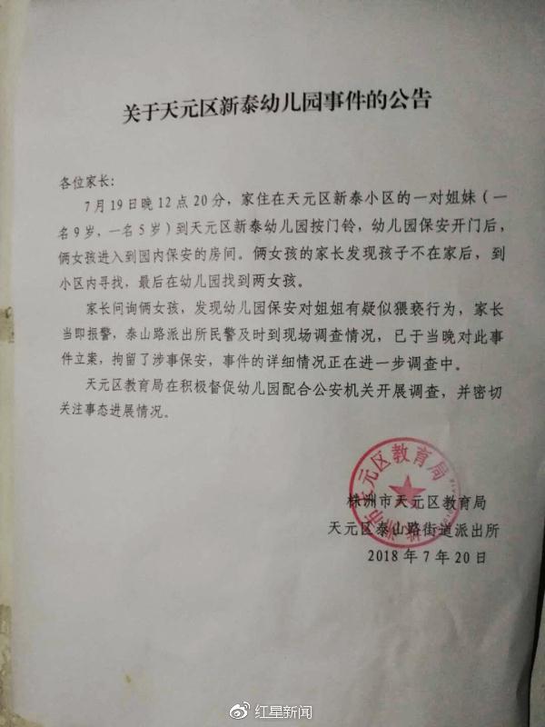 “7月19日晚12点20分,家住在在天元区新泰小区的一对姐妹(一名9岁,一名5岁)到天元区新泰纳儿园按门铃,幼儿园保安开门后,俩女孩进入到国内保安的房间。俩女孩的家长发现孩子不在家后, 到小区内寻找,最后在幼儿园找到两女孩。