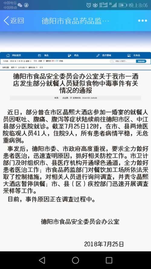 今天,德阳市食品安全委员会办公室发布通报称:近日,部分曾在市区晶熙大酒店参加一婚宴的就餐人员因呕吐、腹痛、腹泻等症状陆续前往德阳市区、中江县部分医院就诊。截至7月25日12时,在市、县两地医院临观人员41人,住院9人,所有患者病情平稳,无危重病例。