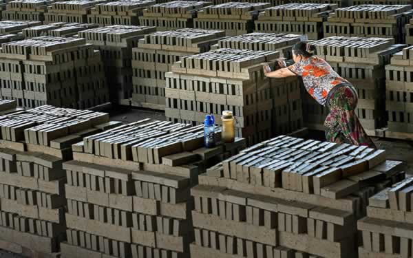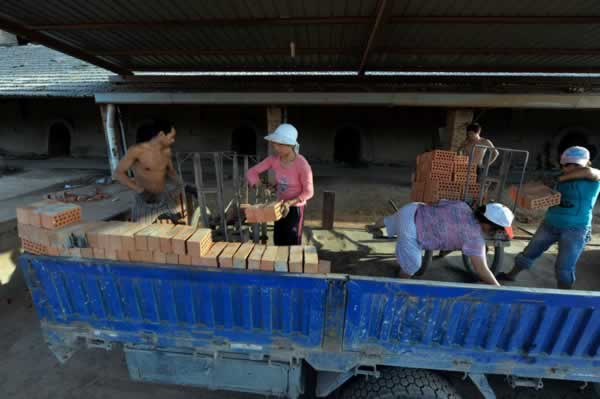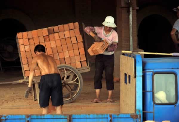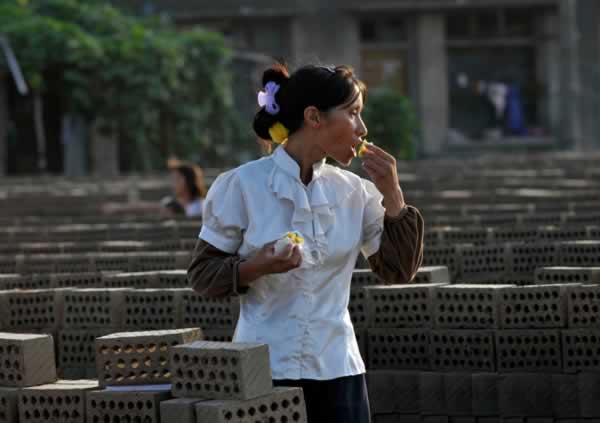 一次夹着3块砖,少说也有7斤重,一车下来,这个动作重复数百上千次,刚开始,她们累得端碗手都发抖,慢慢习惯了,也就不觉得苦累了。据一位砖窑厂的工人说,他们这里是计件制,干的多拿的多,除了阴雨天气,一个月干得好能挣到4千元以上。