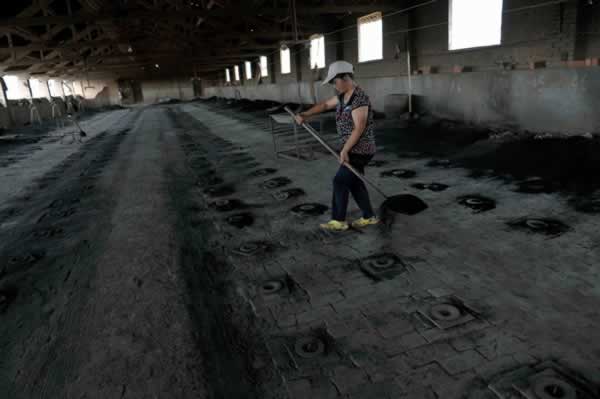 在砖厂烧窑处,一位女工站在窑顶往下注煤。摄影师双脚踩在窑顶上,一下了就感到有股热浪穿过鞋底向上涌来,不一会摄影师上衣就温透了。 铲着煤,这位女工说,她们并不是真的不知道热,只是身上的担子重,她们也想过换工作,只不过没文化、没技术,很难找到比现在工资高的工作。