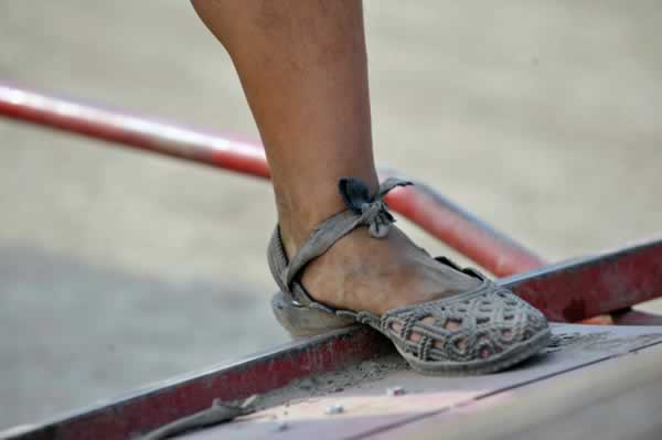 这位女工脚上穿的鞋子,扣带掉了,就找根布条绑住,实在无法跟脚了,才去买双新的、廉价的鞋子。