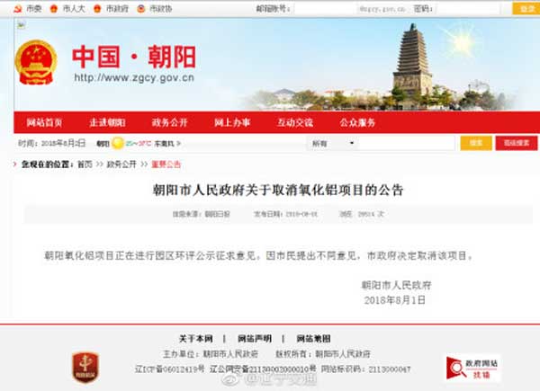 经济观察网 记者 董瑞强 8月1日,辽宁省朝阳市人民政府发布关于停止氧化铝项目的公告,表示“朝阳氧化铝项目正在进行园区环评公示征求意见。因市民提出不同意见,市政府决定停止该项目。”