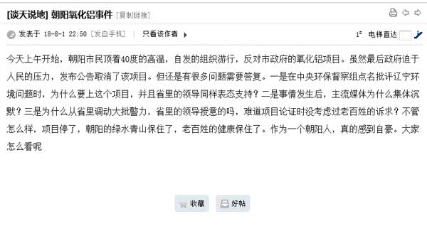 朝阳市民表示,绝不能以牺牲生态环境为代价换取经济的一时发展。为建设生态文明,给子孙留下天蓝、地绿、水净的美好家园,请赶走氧化铝厂。