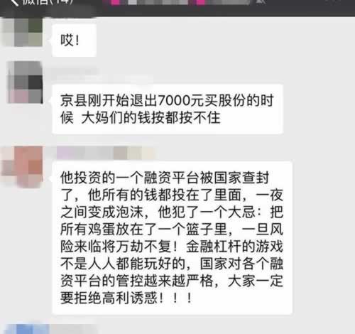 丽江一个微信群里很多人都表示买过京县理财的产品,有微友表示,“我婆婆买了20多万元的,姑妈买了10多万的,还有我姐……”